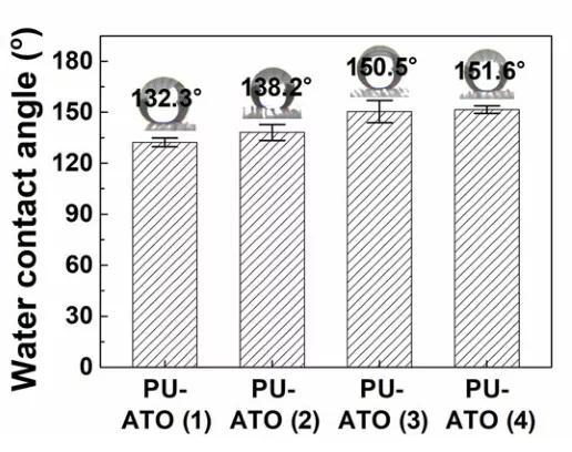 由于纖維吸水會導致IR圖像變形,纖維的疏水性對于保持一定水平的紅外和熱輻射屏蔽能力至關重要。使用接觸角分析儀評估該復合纖維的水潤濕性。如圖4所示,不同濃度(0.5、1.5、3.0和4.0 mmol)的PU-ATO(1-4)復合纖維的水接觸角均≥130°,顯示出疏水性,因此,織物表面上的水滴沒有被吸收,而是易于滾落。