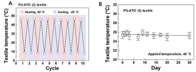 如圖5A所示,經過反復暴露在高(+80°C)和低(?20°C)溫度下,PU-ATO(3)復合紡織品的表面溫度保持穩定。這些結果證實,即使反復暴露在高溫和低溫條件下,復合紡織品的紅外和熱輻射屏蔽性能仍然可以保持。