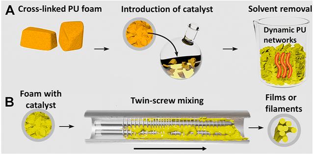 最后,研究人員將此方法應用于從消費品中提取的PU泡沫,并設想該方法可用于處理每年產生的大量PU廢料,研究人員購買了商用PU泡沫塑料,并使用DBTDL催化劑進行微混合和擠出處理。